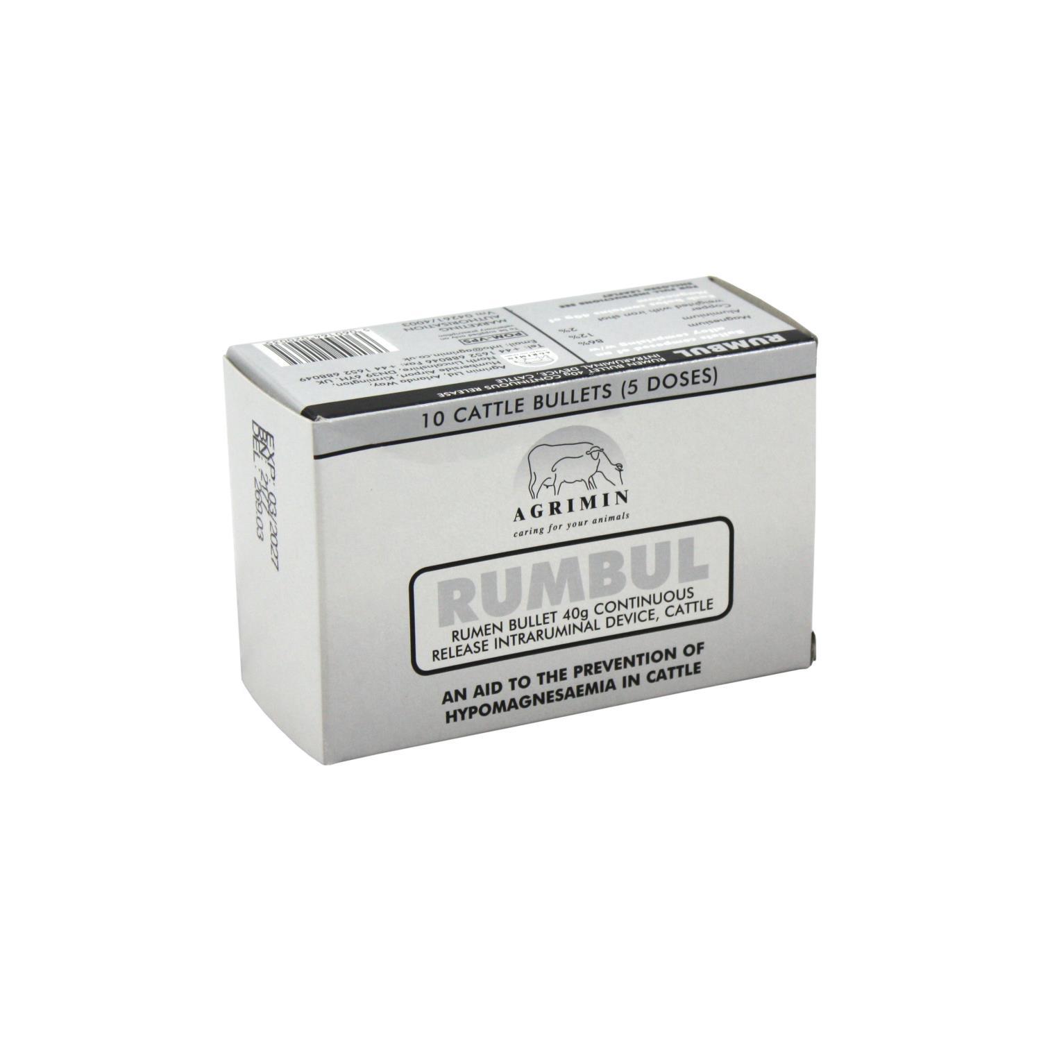 A sustained release bolus containing an alloy of magnesium, copper and aluminium. Licenced to aid the prevention of hypomagnesaemia in cows and ewes grazing rapidly growing Spring grass. Rumbul helps farmers manage the magnesium status of their herd or flock over high risk periods.