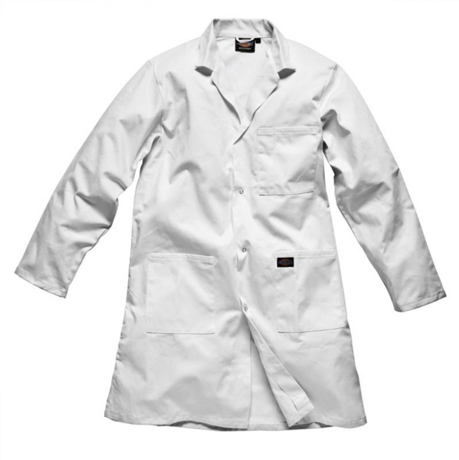 White Warehouse Coat with stud fastening. Made from extremely hardwearing 65 % polyester, 35 % cotton fabric with side vents and side access slits in the seam. Two large hip pockets and a chest pocket with pencil division.
