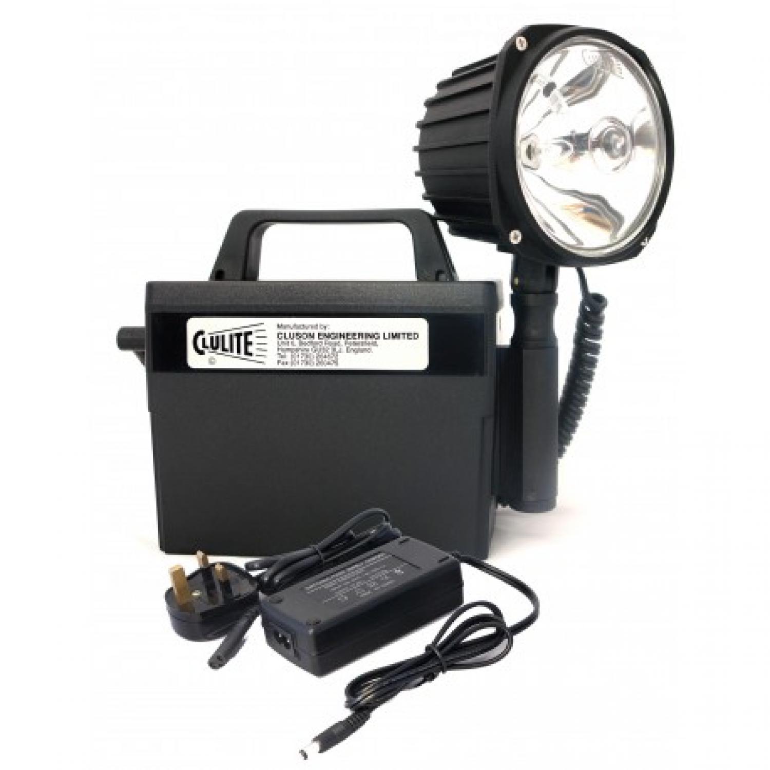 12 volt torch with double bulbs - 1 million candlepower beam giving 1000-2000 metres. Fast charging. Operates for 1.5 hours on main beam, 12 hours on secondary. Mains charger, 12 vehicle charger and carry strap included.
