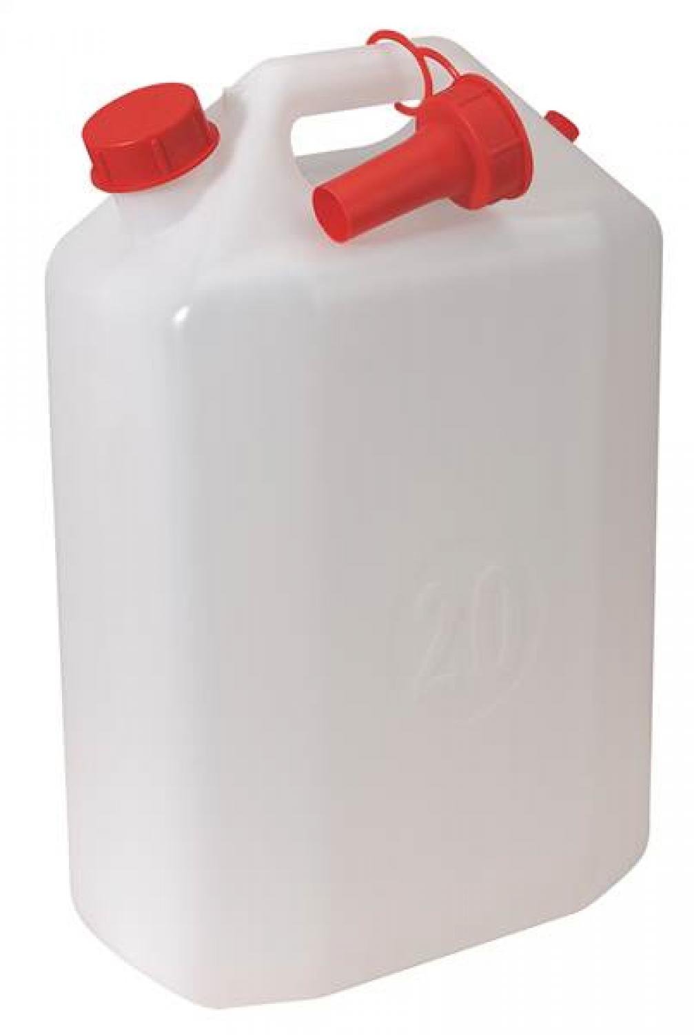 20 litre vinyl water canister, with screw top, non-spill lid, removable pour spout attachment, and easy carry handle. Also has space for an additional air spout (with sealing screw-top lid provided) to promote a fast and easy flow.