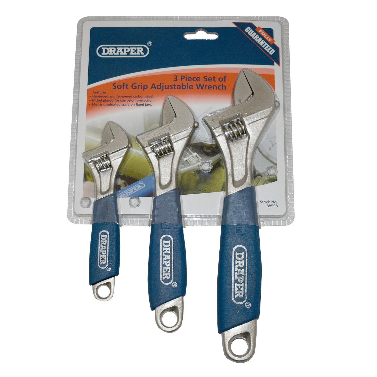The Draper 3 piece set of soft grip adjustable wrenches dimensions are approximately 150, 200 and 250mm long
